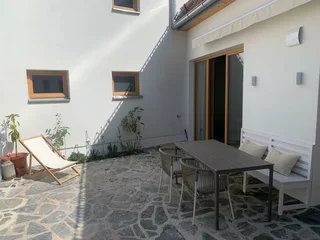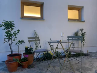 GARDEN LOUNGE ist nach Süden zum Innenhof ausgerichtet. Sowohl das Wohn-/Küchenzimmer (mit Schlafsofa) als auch das separate Schlafzimmer (Bett 140 x 200 cm) verfügen über große Glastüren. Im Sommer wird die Gartenterrasse zu einer Erweiterung des Wohnzimmers. Kleines Badezimmer (WC und Dusche), viel Stauraum und ein kleiner Schreibtisch. Gemütliche, sonnige Gartenterrasse mit vielen Kräutern!