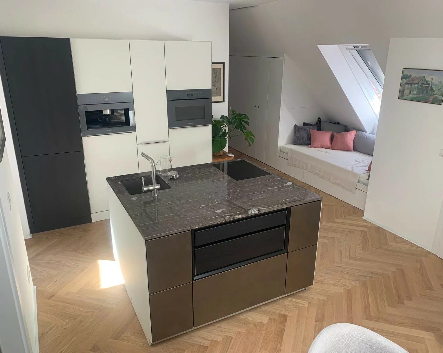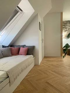 STYLISH_on_TOP bietet höchsten Wohnkomfort mit herrlichem Ausblick durch die nach Süden ausgerichteten Dachfenster! Es befindet sich im obersten Stockwerk des mittleren Gebäudeteils, der durch die historische Steinmauer der kremsoase geprägt ist. Das Herzstück dieser Wohnung ist der offene Wohnbereich mit einer Designerküche, die sich zur überdachten und windgeschützten Terrasse hin öffnet. Die beiden Schlafzimmer (Bettgröße: 140 x 200) bieten reichlich Stauraum. Im Badezimmer bietet die Badewanne einen direkten Blick in den Himmel!