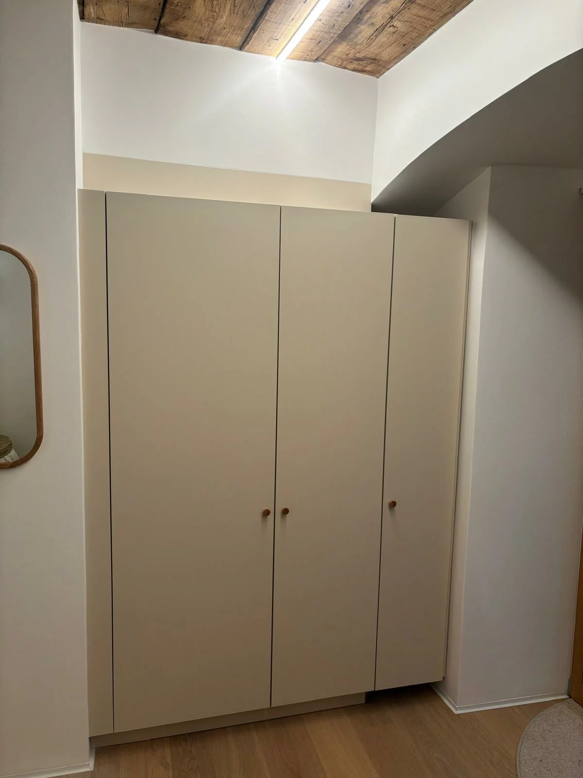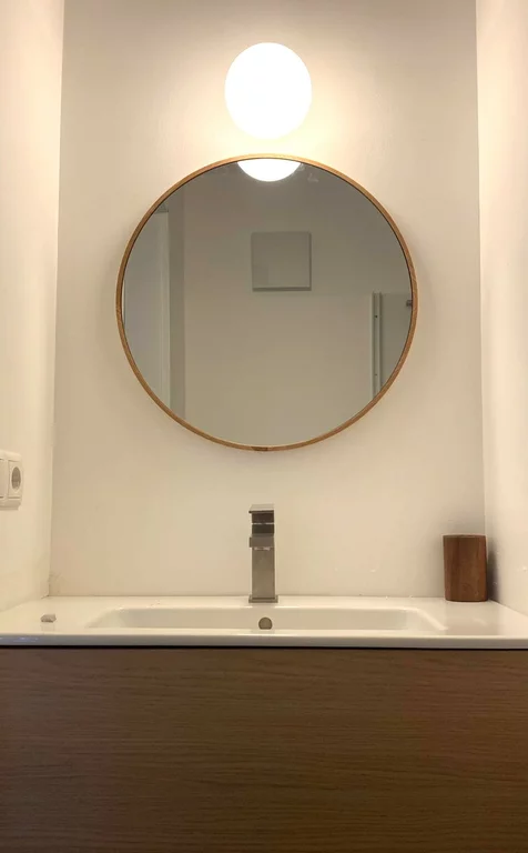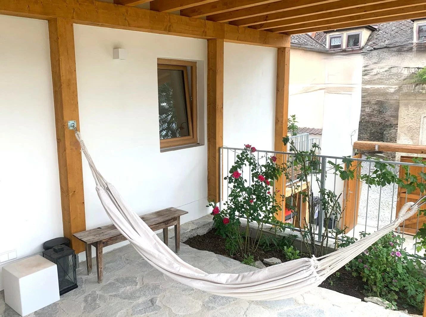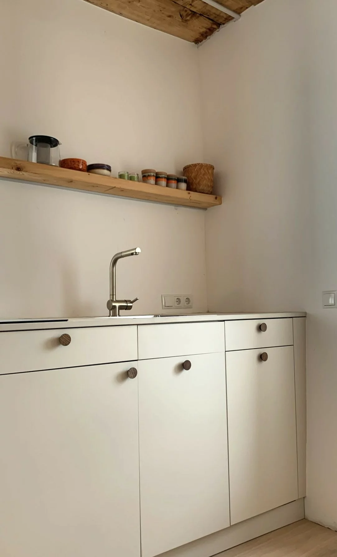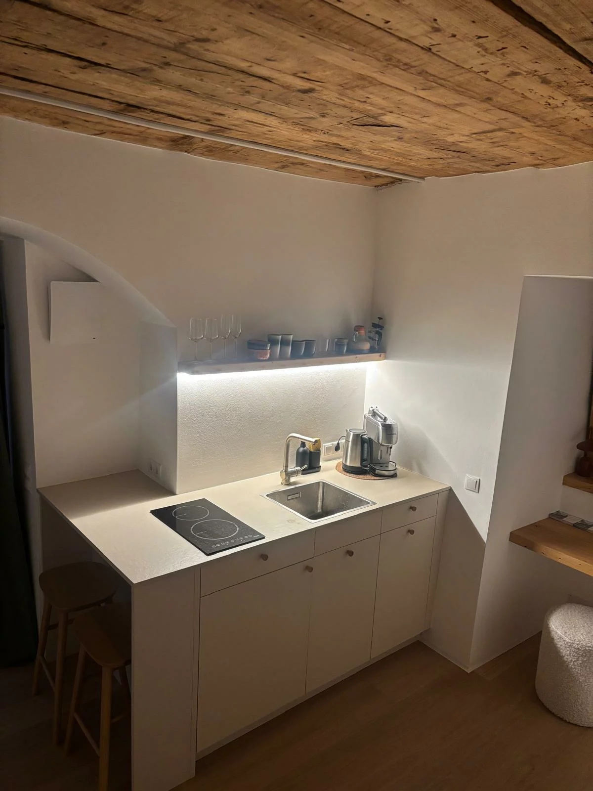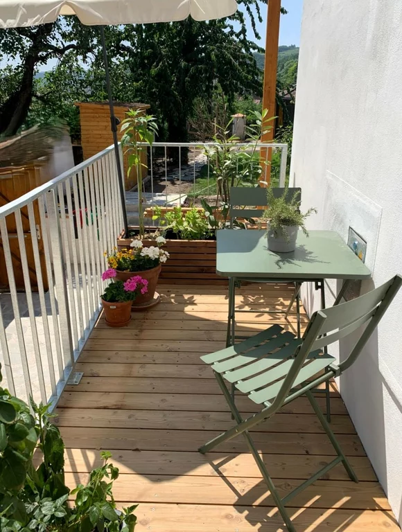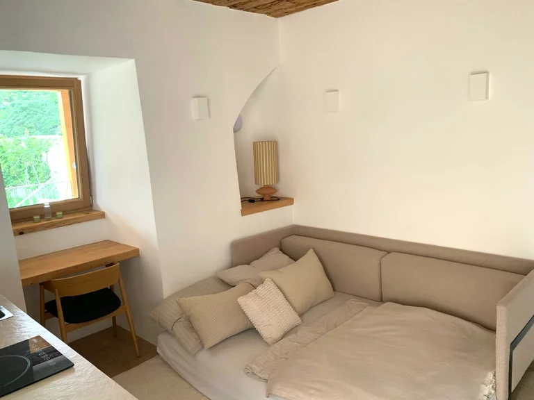 Top 1b - Tiny Shelter is basically part of Top 1, but can be seperated due to its own entry door. It is a purist but relaxed one-room-apartment with a compact kitchenette and dining table, sofa bed (with mobile table), warerobe and a small bathroom with shower and toilette.With a wooden ceiling and minimalist design, it nevertheless offers all the functions and cosiness you need for a peaceful stay. It is located on the ground floor and is accessible via the adjoining terrace - and provides additionally its own private sunny terrasse.