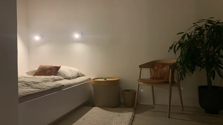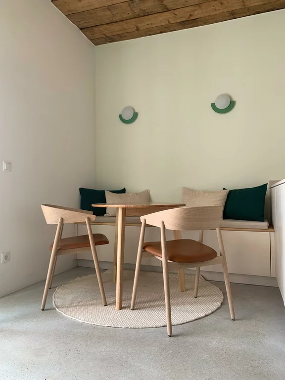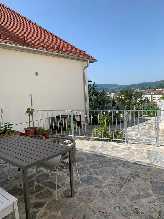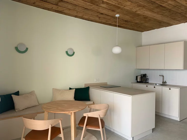 Top 4 GARDEN LOUNGEfaces south towards the inner courtyard and is located on the ground floor of the middle tract: Both the kitchen/living room (with sofa bed) and the separate bedroom (140x200 bed) have large glass doors. In summer, the garden terrace becomes an extended living room. Small bathroom (WC and shower), plenty of storage space and a small workstation.Cosy, sunny garden terrace with lots of herbs!
