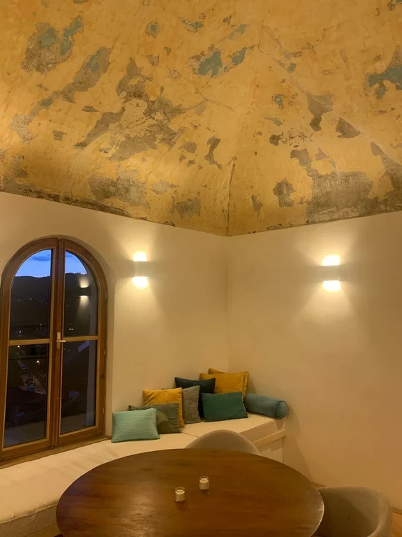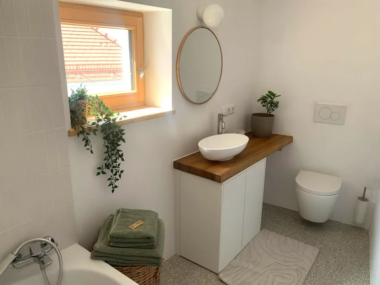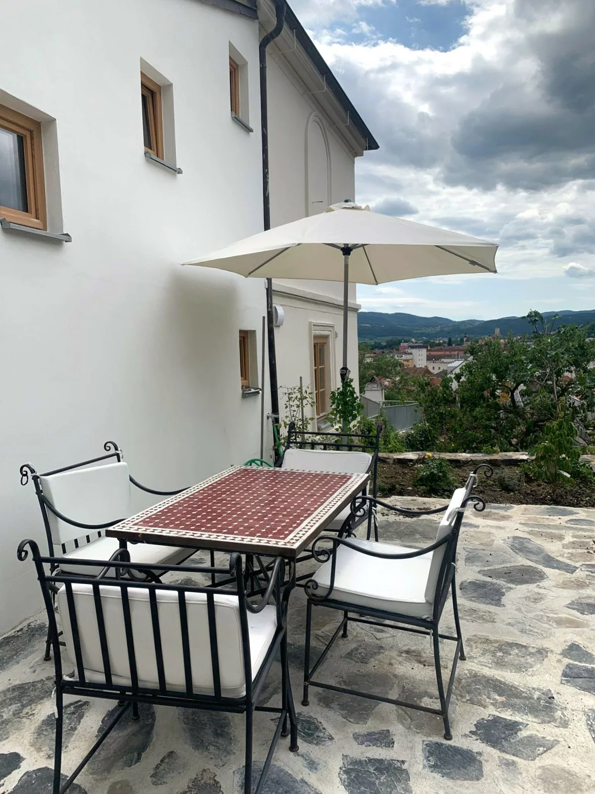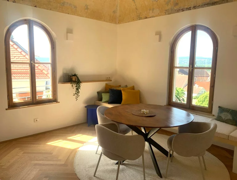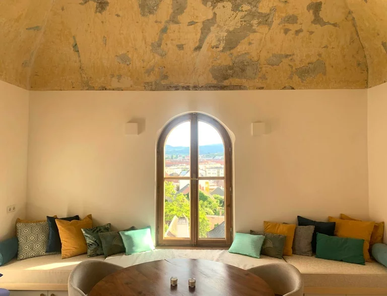 Top 6 SUNNY TOWER impresses by its historic ensemble - and its sunny atmosphere. .The listed tower area with its exposed domed roof houses a kitchen andliving room. There is a seperated small bedroom (bedsize: 140x200) and the bathroom owns a bathtub with a view of the Piarist Church. The apartment is structured bythe historic stone wall. Additionally, there is spacious stone terrace for private use. This apartment is ideal or recommendfor `couples in love“;)